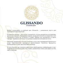 Клубный дом Glissando (Глиссандо) проводит торжественные мероприятия на собственной территории, летней террасе, пирсе на берегу пруда. Здесь действует система пробкового сбора. В стоимость организации банкета входит полное обслуживание, мебель, классический текстиль. В клубном доме можно провести детский праздник. В клубном доме Glissando (Глиссандо) действует аренда беседок на 6 и 10 персон. Именинникам предоставляется скидка – 10 %. Для вашего удобства в продаже имеется: мясо для шашлыка, розжиг, уголь, кальяны. Вы можете заказать блюда из меню ресторана, или заказать обслуживание.